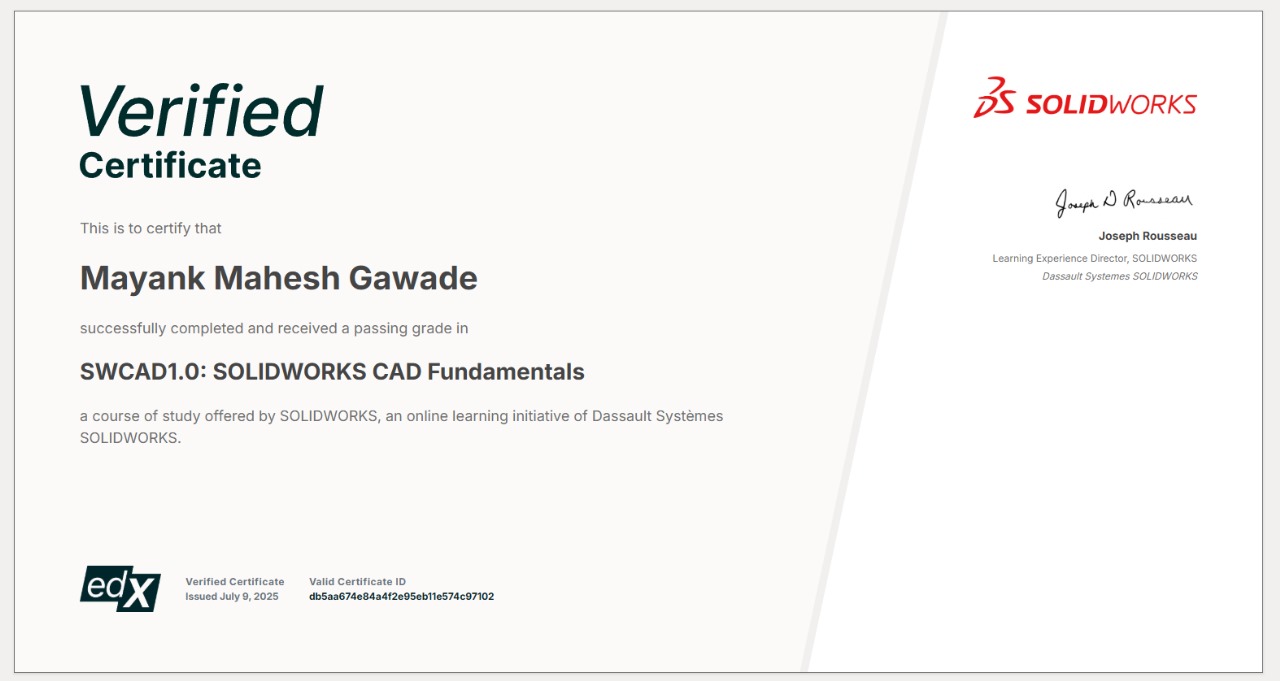 Gained hands-on experience in 3D part modeling, assemblies, and engineering drawings using SolidWorks.